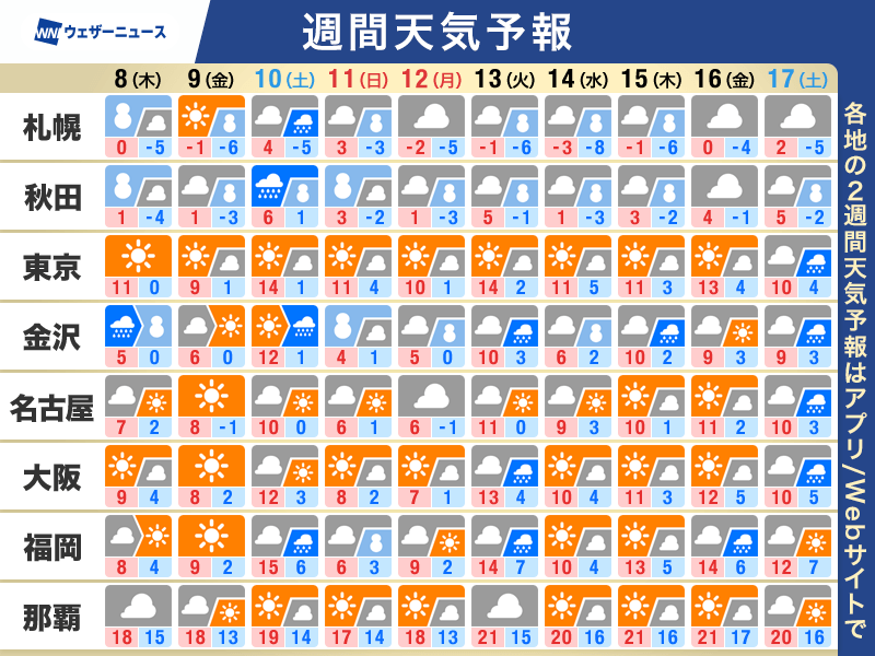 連休2日目となる11日(日)からは強い寒気が流れ込み真冬並みの寒さとなるものの、連休明けの13日(火)は一時的に寒さが緩む見込みです。