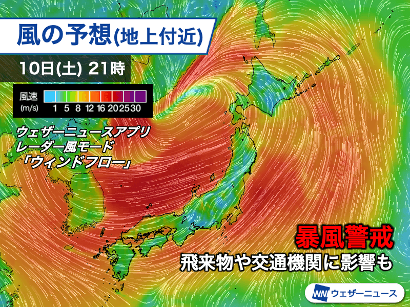 日本海沿岸部や、関東南部付近では夜にかけてさらに強まる予想です。平均で20m/s、瞬間的には30m/s以上の暴風が吹き荒れるおそれもあるため、飛来物等に警戒してください。