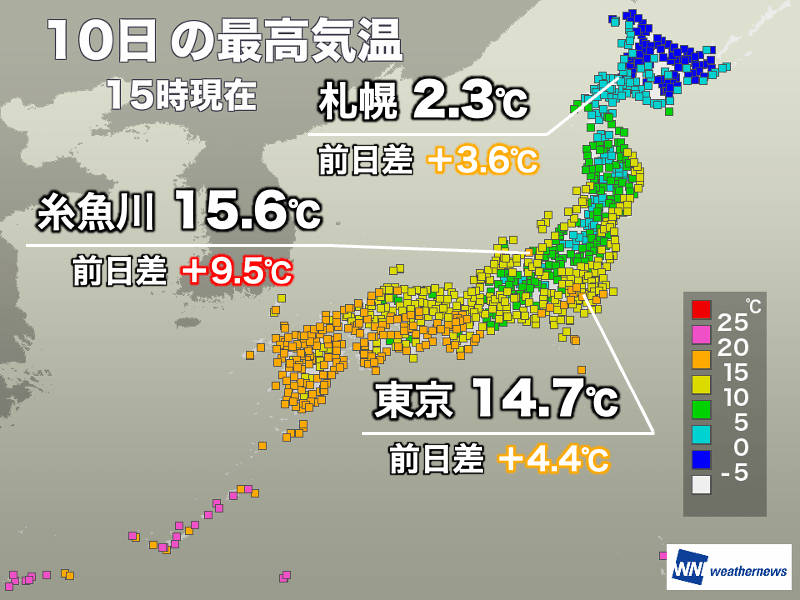 15時までの最高気温は、西日本の広い範囲で15℃以上、北陸でも新潟県糸魚川市で15.6℃を観測しました。糸魚川市は昨日より9.5℃も高く、4月中旬並みの気温です。低気圧に向かう南寄りの風が山越えとなって、フェーン現象が発生したとみられます。