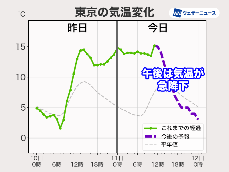 東京都心では午後になると気温が急降下し、夕方18時には5℃まで下がる予想です。北風が加わってかなり寒くなりますので、外出の際は帰宅タイミングの気温や風を考慮して服装をお選びください。
