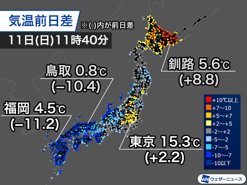 関東や北海道道東などは、まだ寒気の影響が小さいことや南寄りの風が吹き込んでいることで昨日よりも高い気温です。東京都心は2.2℃高い15.3℃、北海道釧路市は8.8℃高い5.6℃で、真冬とは思えません。