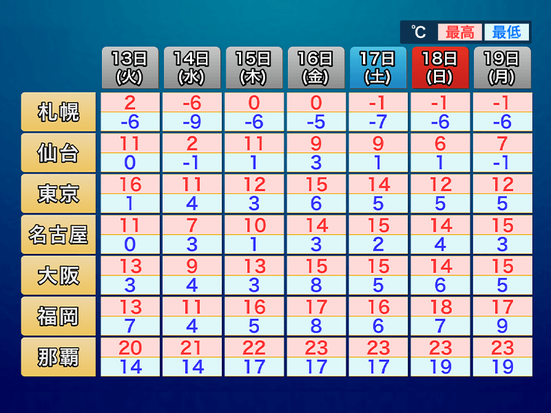 各地の予想気温をみると、北日本は明日13日(火)に一旦上昇し、明後日14日(水)は大きく下がります。15日(木)以降は変化が小さくなり、札幌市では最高気温が0℃前後、最低気温は−6℃前後の日が続く見込みです。