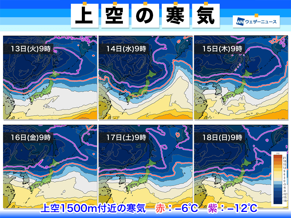 上空1500m付近の寒気の動きを見ると、明日13日(火)は大きく北上します。明後日14日(水)は再び南下し、15日(木)になるとまた北上と、週の中頃までは日毎の変化が大きくなる見込みです。