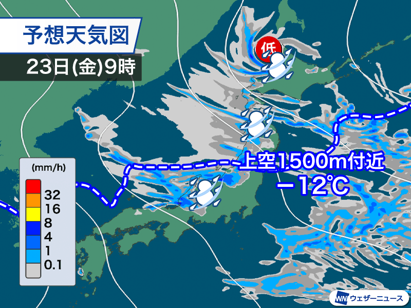 明日の夜からは上空5500m付近で−36℃以下の寒気を伴った気圧の谷が近づき、明後日24日(土)にかけて次のピークになる見通しです。
