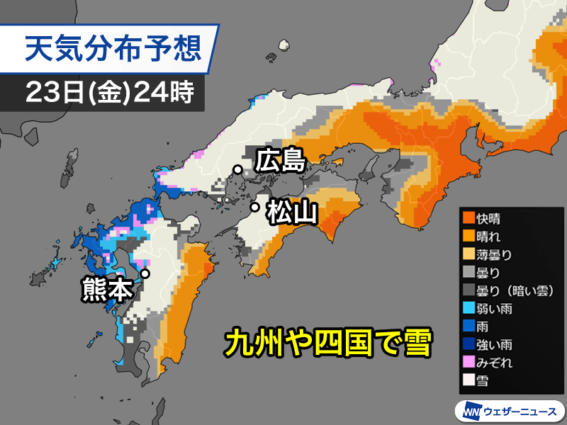 九州や四国の内陸部では明日の夜遅くから雪が降り出し、明後日の朝は積もる可能性があるため、車で移動の予定がある場合は注意が必要です。