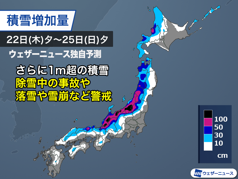 25日(日)夕方までの積雪増加量は東北南部から北陸の山沿いで100cm以上に達する予想となっています。