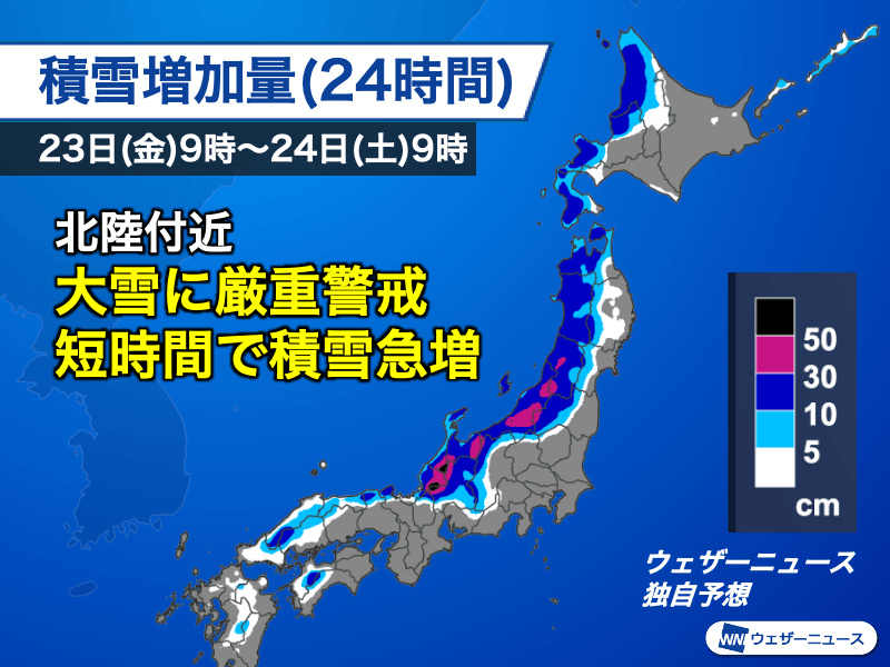 明日24日(土)朝までの24時間で、北陸付近では新たに30cm前後、多い所では50cm前後の積雪増加が見込まれます。活発な雪雲が通過して、短時間で一気に増えることもありそうです。路面状態の悪化だけでなく、落雪や雪崩の発生などにも警戒してください。