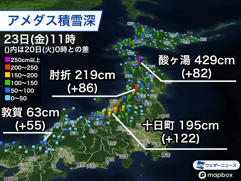 21日(水)頃から、日本列島の上空には寒波が襲来しています。日本海側は各地で積雪が増えて、23日(金)11時時点の積雪深は青森県青森市・酸ケ湯で429cm、山形県大蔵村・肘折で219cmとなりました。
