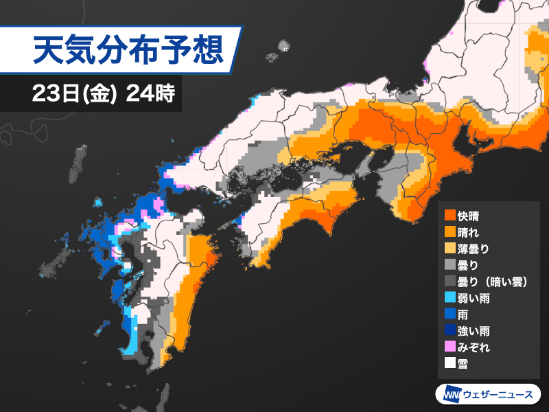 九州や四国は、現在は晴れている所が多くなっていますが、夜の遅い時間ほど雨が降りやすくなります。内陸部や山沿いでは雪となり、明日の朝は積もる可能性もあります。車で移動の予定がある場合は注意が必要です。