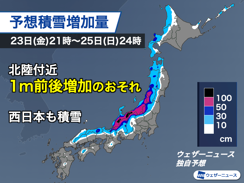 寒波は25日(日)頃まで続く見通しです。今夜から25日(日)夜までの積雪増加量は北陸の多い所で1m以上に達する予想となっています。