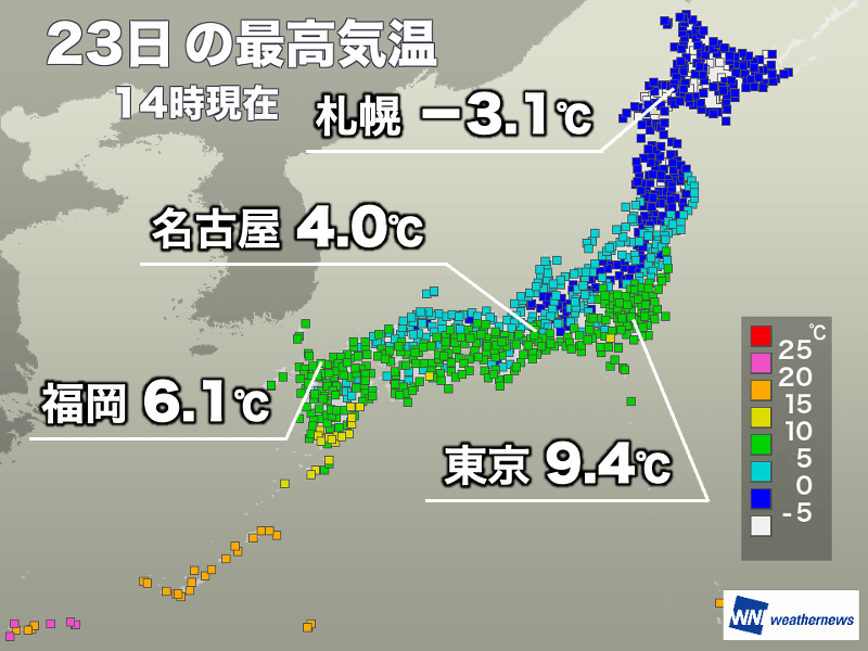 昼間も空気が冷たく、各地で気温の上昇は鈍くなっています。14時までの最高気温は東京都心で9.4℃、名古屋市で4.0℃、大阪市で7.3℃、福岡市で6.1℃など、一桁の所がほとんどです。