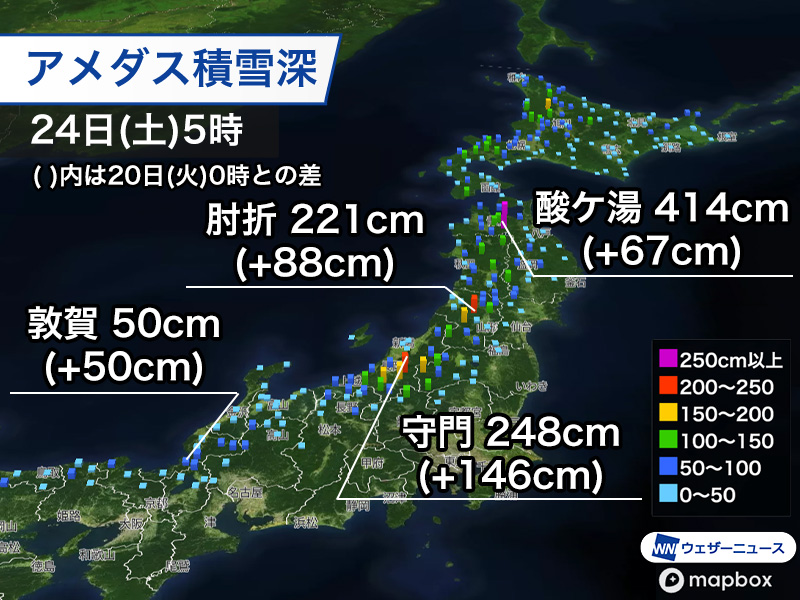 24日(土)5時時点での積雪深は新潟県魚沼市の守門で248cm、十日町市で184cmとなっており、20日(火)0時に比べると100cm以上増加しています。