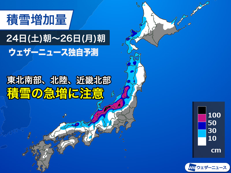 各地、短時間で積雪が一気に増加するおそれもあります。すでに積雪が多い地域では交通障害に加え、雪崩や落雪、除雪中の事故などの危険性が高まるため、厳重な警戒が必要です。