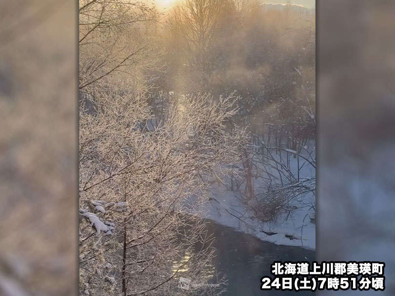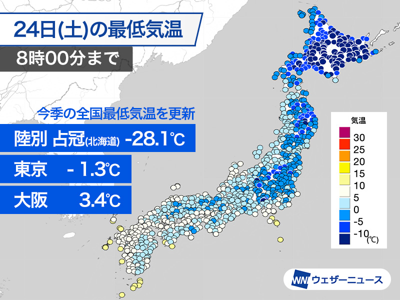 今朝、全国で最も気温が下がったのは北海道上川地方の占冠村と十勝地方の陸別町のアメダスで、−28.1℃を観測しています。今季の全国最低気温を更新しました。