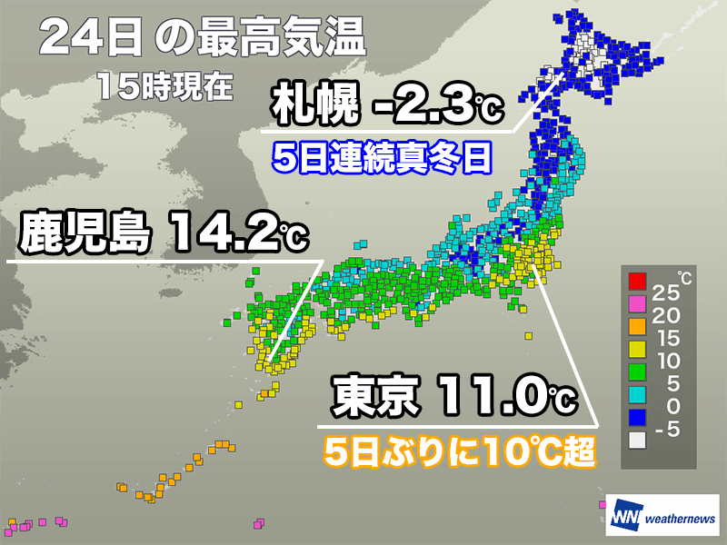 東京都心は5日ぶりに10℃到達 北日本や北陸は厳しい寒さ続く