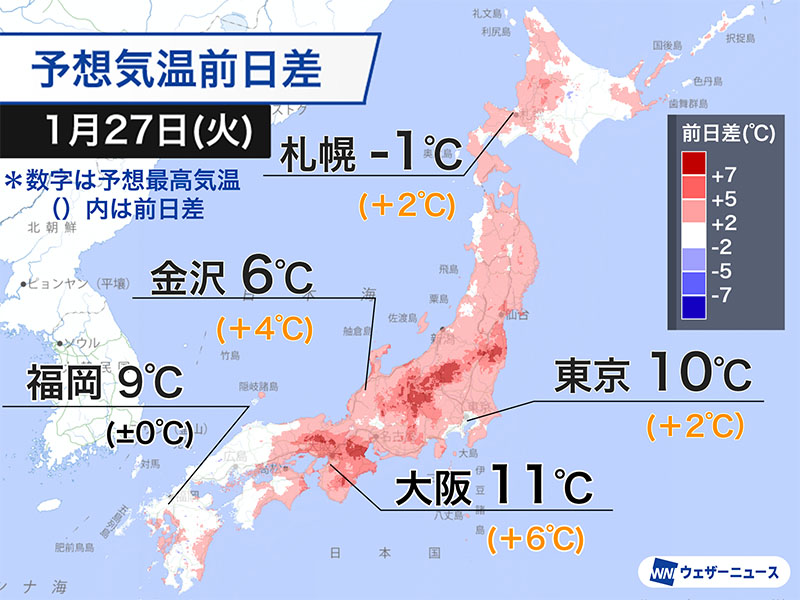 北陸の最高気温は、新潟や金沢で6℃、富山や福井で5℃と、昨日より3〜4℃程度上がる予想です。