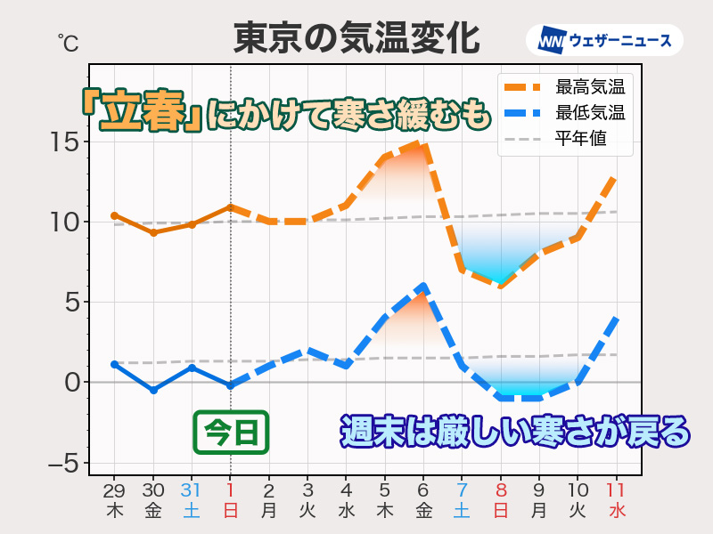 二十四節気「立春」にあたる4日(水)頃には、強い寒気が北へ後退し、日中は春を感じる暖かさとなる所もあるとみています。東京の最高気温は5日(木)は14℃、6日(金)には15℃まで上がる予想です。このタイミングで花粉が飛び始める可能性もあるため、花粉症の症状の出やすい方は対策をしておくのが良さそうです。