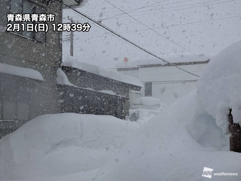 青森市は、朝のうちは青空が広がりましたが、昼前からシアラインに伴う活発な雪雲がかかって天気が急変しました。アメダス青森では、12時〜13時の1時間で7cmの雪が新たに積もっています。13時時点の積雪深(地面からの雪の厚み)は174cmと、今季これまでで最も多くなりました。