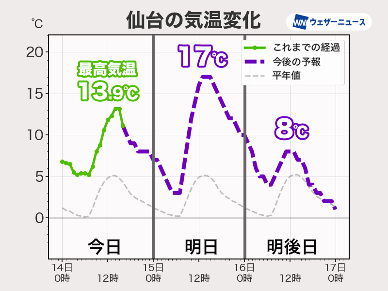 この時期は暖かな空気が流れ込んだ後、一気に寒気へと入れ替わることが良くあります。明日15日(日)は北日本方面まで暖気が流入するため気温が上がり、仙台市の最高気温は今日に比べて4℃高く、4月下旬並みの17℃の予想です。