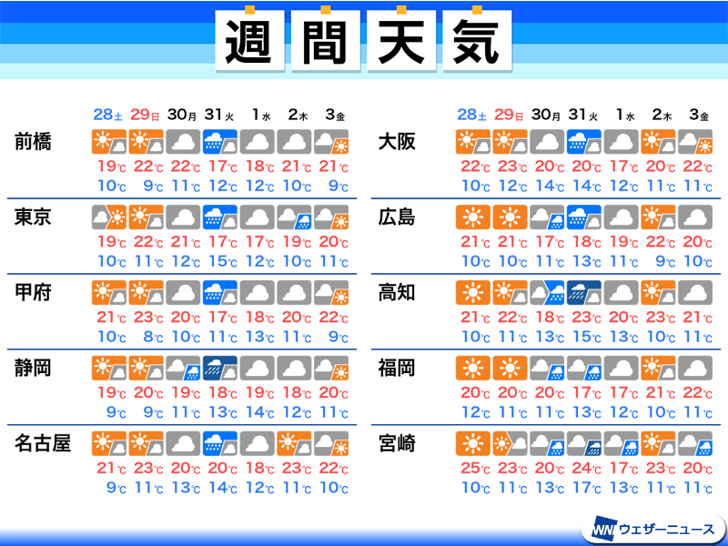 東海から西日本は土曜日の方が青空