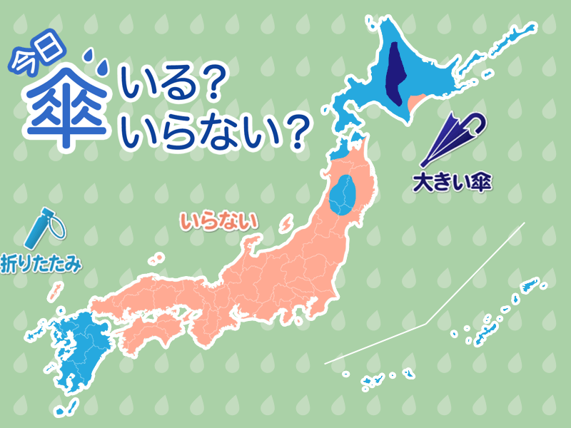 北海道の平地や東北の内陸でも午前を中心に雨の可能性があります。雨具の置き忘れにご注意ください。九州でも雨の可能性があり、夜ほど降りやすくなります。
