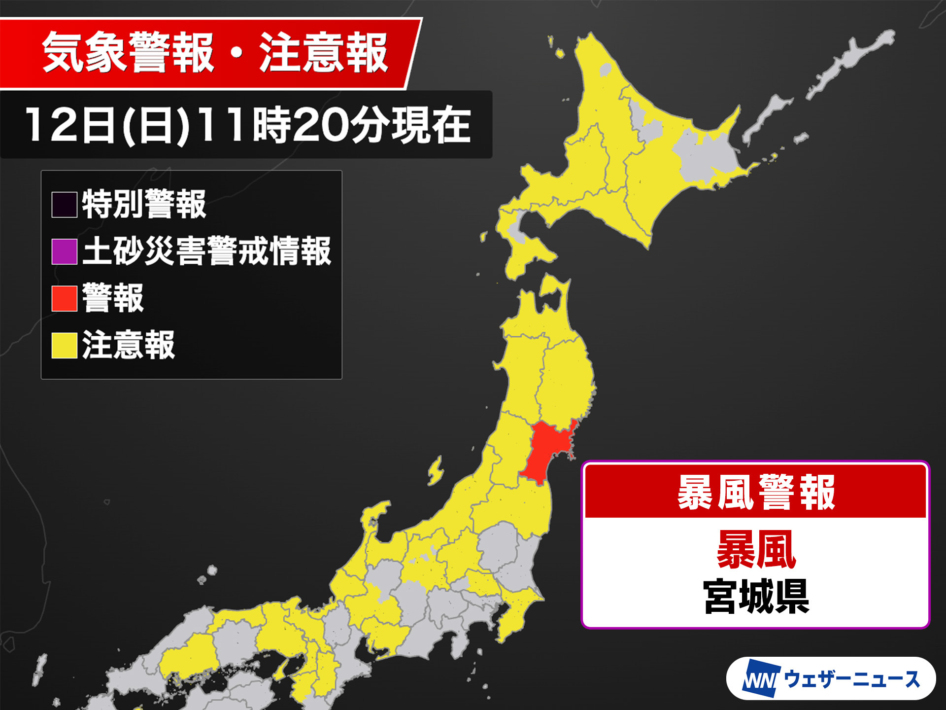 仙台市でも7時59分に26.6m/sを観測し、11時20分現在、宮城県には暴風警報が発表されています。