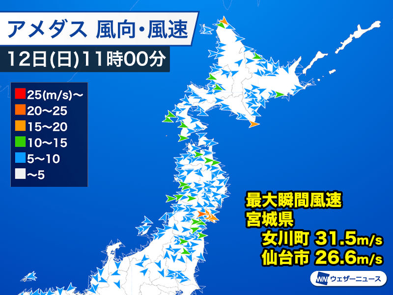 今日12日(日)の北日本は天気が回復傾向となっているものの、沿岸部を中心に引き続き風が強く吹いています。7時56分には宮城県女川町で最大瞬間風速31.5m/sを観測しました。