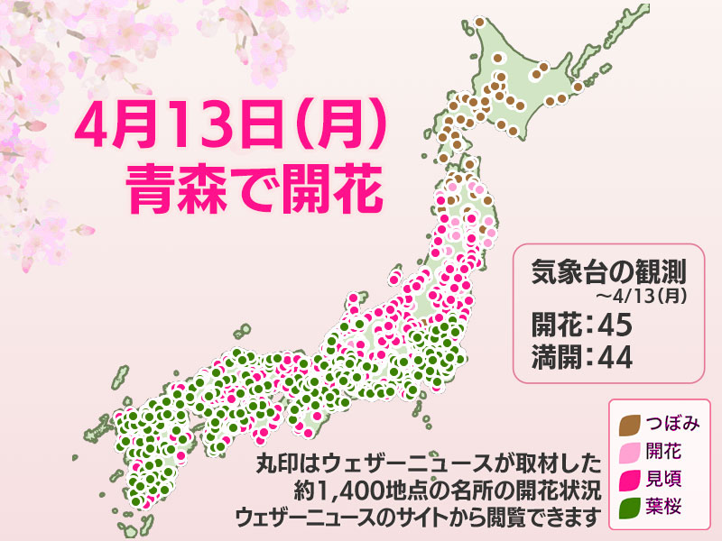 今日の桜開花状況 4月13日(月) 青森で開花発表