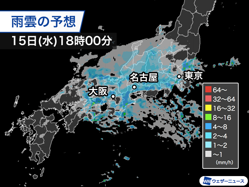 午後になり西日本各地に雨雲が広がり、九州では強く降っている所もあります。明日15日(水)は東日本にも雨の範囲が拡大するる見込みです。