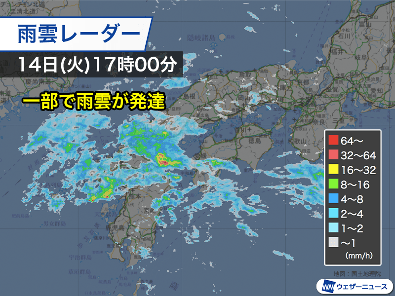 九州北部は活発な雨雲が目立ち、17時00分までの1時間には長崎市で9.5mm、福岡県行橋市や山口県下関市で6.0mmの雨を観測しています。