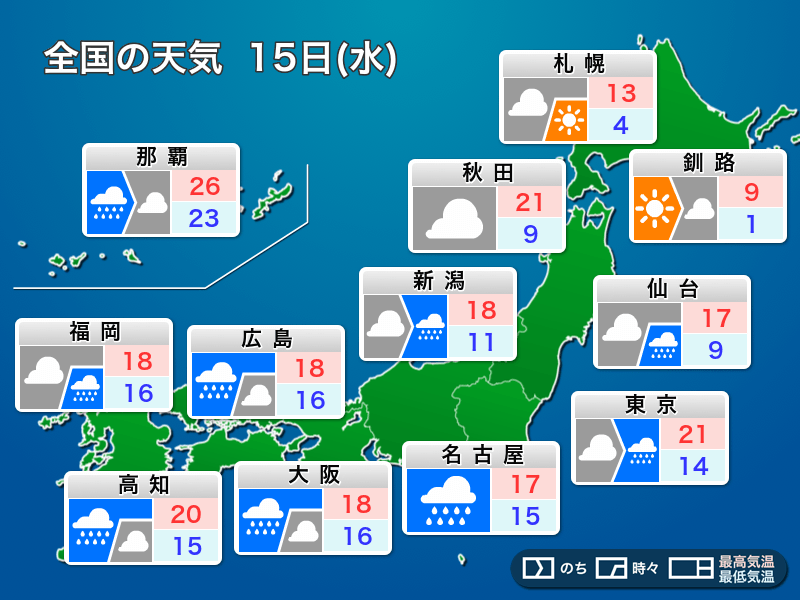 関東の気温は今日14日(火)ほどは上がらないものの、20℃前後で過ごしやすい陽気となります。