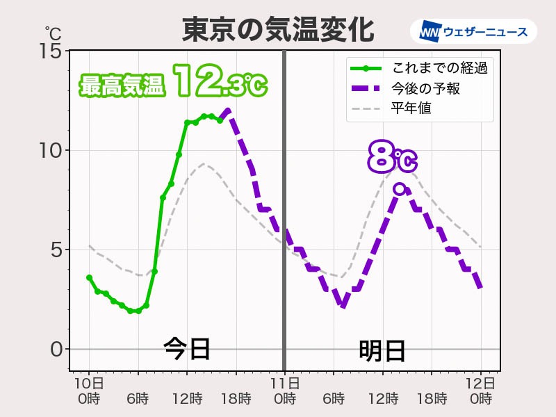 東京都心の朝の最低気温は2℃くらいで今朝と変わらない予想となっています。そこからの気温の上昇ペースが遅く、昼前にようやく5℃を上回るくらいです。午後も10℃には届かず、平年よりも低めで推移します。最高気温は真冬並みの8℃の予想で、風がある分だけ体感温度はさらに低くなる見通しです。