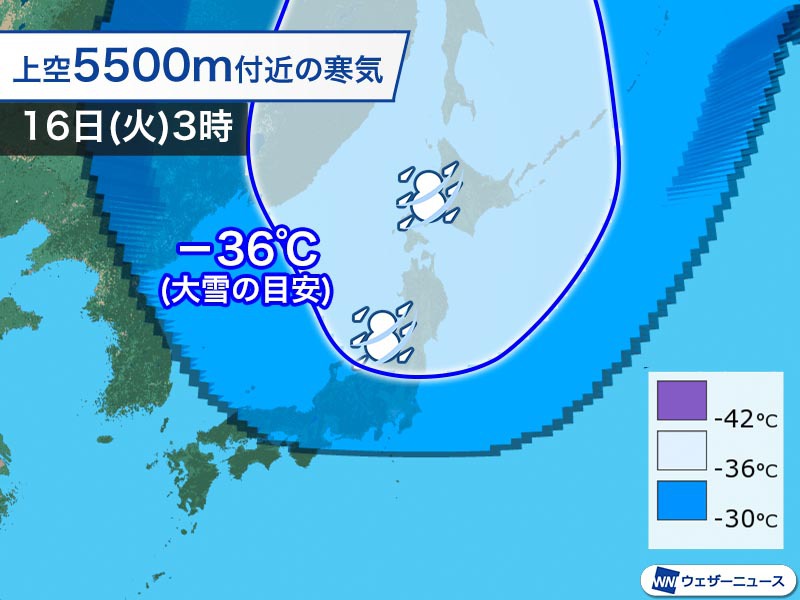 寒気は15日(月)の夜から16日(火)の朝にかけて最も南下するとみられ、大雪の目安となる上空5500m付近で−36℃以下の寒気が北陸付近まで流れ込む予想となっています。