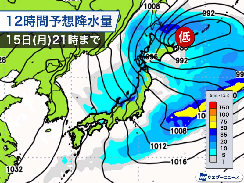 15日(月)は低気圧が発達しながら北海道付近を通過し、夜には千島列島まで進む予想となっています。日本列島は冬型の気圧配置が強まって、北海道から北陸、山陰にかけての広い範囲で雪になり、16日(火)にかけて断続的に降り続く見込みです。