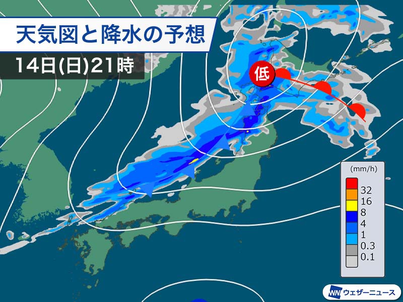 明日14日(日)は低気圧や前線が接近し、北日本で天気が崩れます。15日(月)の朝にかけては西日本、東日本でも雨や雪の降る所があり、全国的に風が強まる見込みです。その後は冬型の気圧配置となります。