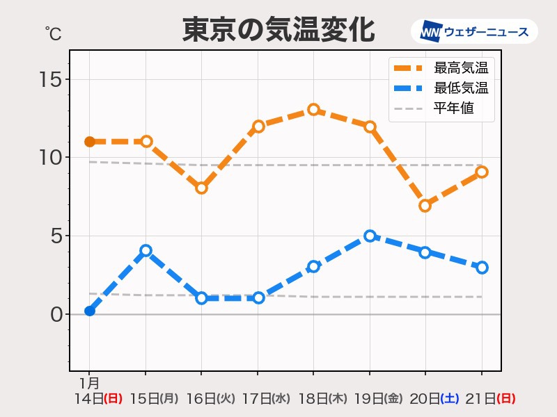 最低気温との寒暖差や、日々の気温変化が大きな一週間となります。体調を崩さないよう、お気をつけください。