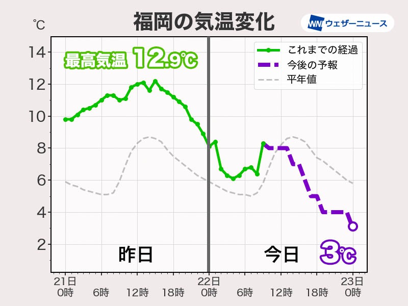 この後はあまり気温が上がらず、福岡市は午後にかけても10℃に届かない予想となっています。夕方には朝以上に気温が低くなり、日付が変わる頃は3℃まで下がる見込みです。