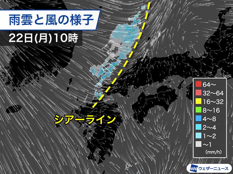 日本海には南北に伸びるシアーライン(風の流れが変化する境界線)が形成され、その周辺で雨雲がまとまってきました。雨雲の一部は九州を通過していて、弱い雨の降っている所があります。
