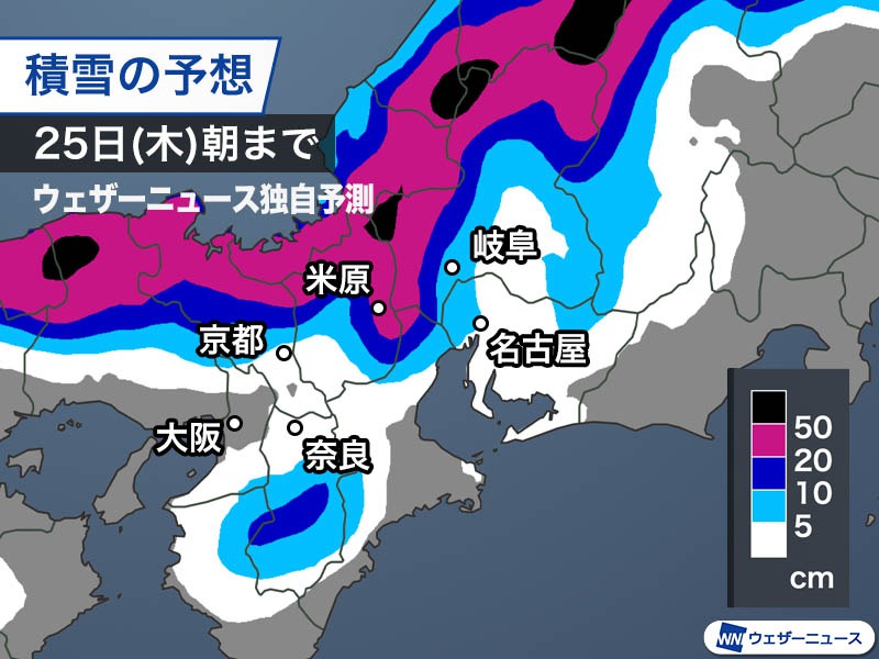 また、近畿も北部だけでなく中部まで雪の範囲が広がり、京都市内でもしっかりと雪の降る可能性があります。雪雲の通り道になる滋賀県内は南部でも大雪になる見込みです。大阪市内は一時的に雪になることはあるものの、積もるほどは降らないとみられます。