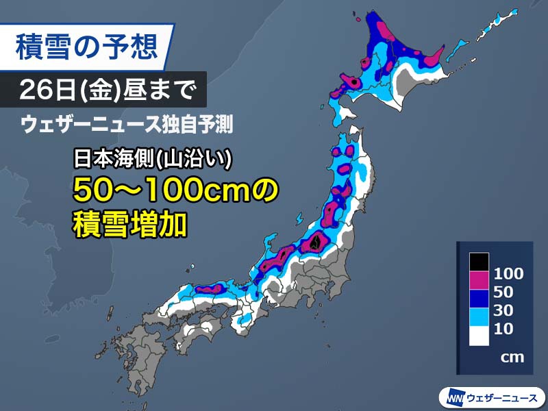 今日昼から明日夜までの積雪増加量は、山陰から北陸、東北にかけての山沿いを中心にさらに50cm以上が予想され、山間部の多い所では100cm前後に達するとみられます。内陸の市街地でも多い所では30cm前後の新たな雪が積もる見通しです。現在は雪が小康状態の北海道も今日の午後から雪が強まる予想となっています。