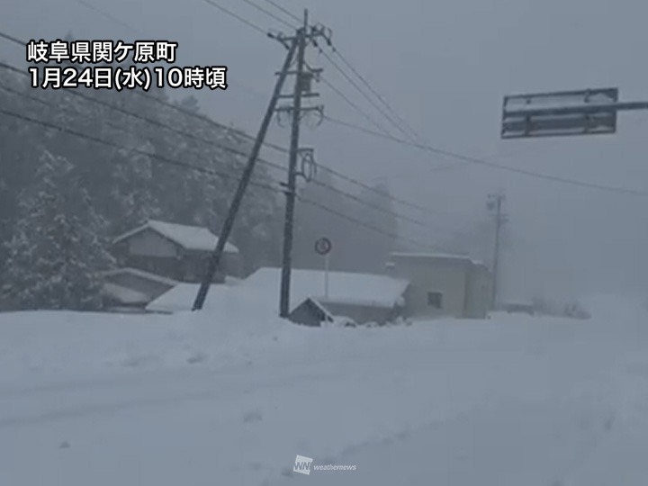 10時までの1時間に滋賀県米原市で8cm、岐阜県関ケ原町で7cm、京都府舞鶴市や島根県松江市では4cmの雪を観測。米原市や関ケ原町は3時間で20cm以上、積雪が増加し、岐阜市でも13cmの積雪を観測しました。周辺を走る名神高速は通行止めで、東海道新幹線にも遅れが出ています。名古屋市内にも雪雲は流れ込んでいて、雪が積もる可能性があります。