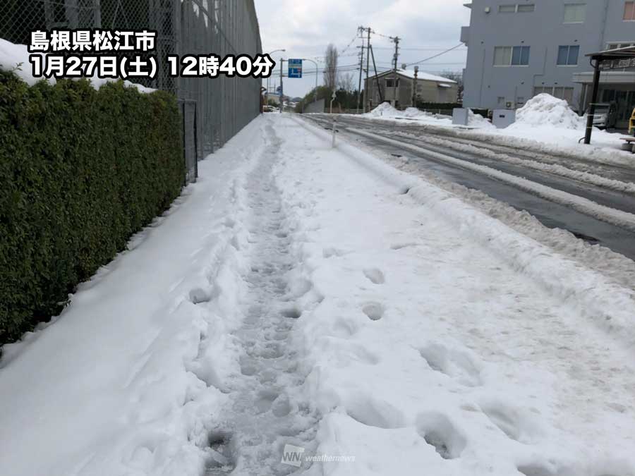 今日は、先日大雪となった山陰や近畿北部では5℃を超える気温となっています。16時までの最高気温は、松江(島根)で8.1℃、鳥取で7.3℃、豊岡(兵庫)で6.1℃、米原(滋賀)で6.2℃でした。また、金沢(石川)で6.7℃、富山で6.6℃、秋田で5.1℃など北陸や東北日本海側でも雪解けが進む気温です。