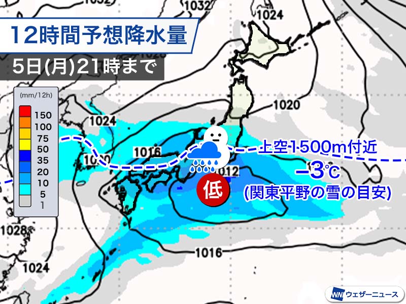 東シナ海で低気圧が発生して5日(月)の朝に九州付近に達し、その後、6日(火)にかけて本州の南を東に進む予想となっています。低気圧の通過に伴って西日本から東北にかけての広い範囲で天気が崩れ、関東でも雨や雪が降る見込みです。