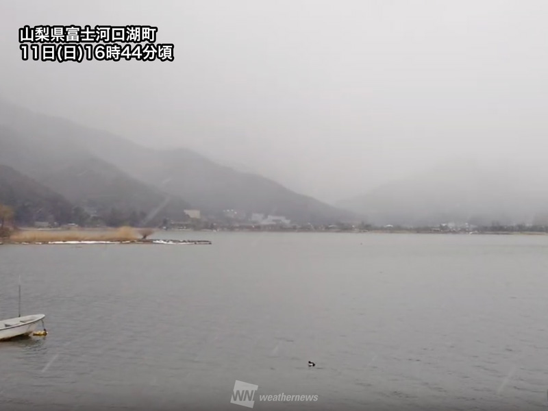 今日11日(日)の関東甲信地方は、午前中は各地で青空が広がりました。しかし、西から上空の寒気が接近して午後は雲が多くなり、夕方には所々で雨雲が発生しはじめ、山梨県など山間部では雪が降っているところもあります。