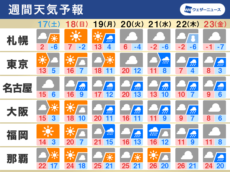 今週末の西日本や東日本は、近畿から関東の太平洋側沿岸部で雲が多いものの、広範囲で日差しが届く見込みです。