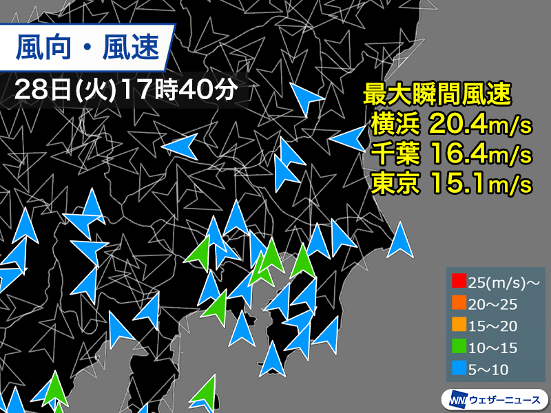 関東で風が強まり東京、横浜でも15m/s超