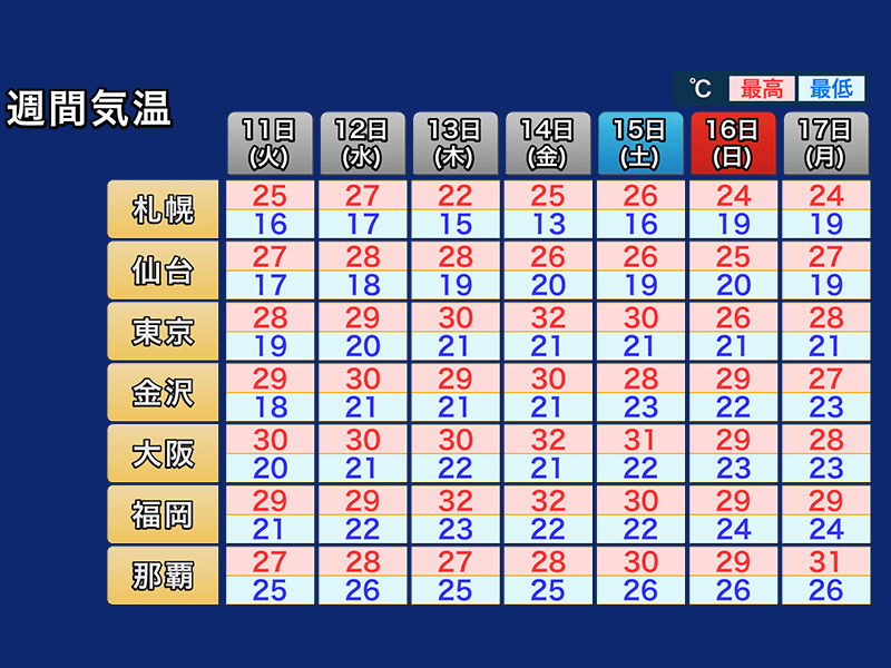 最低気温も高めとなり、週後半は各地で22℃くらいが予想されています。最低気温が上昇することで、25℃を上回るタイミングも早くなり、暑く感じられる時間がこれまで以上に長くなる見通しです。