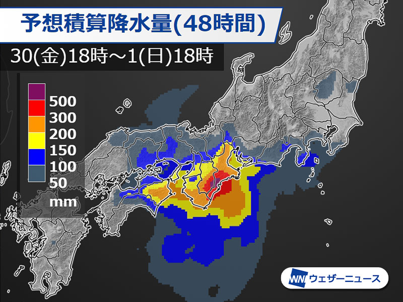 今後48時間で、三重県や奈良県の山沿いで最大500mm以上の雨が予想され、三重県北中部や奈良県南部、和歌山県南部でも200mm以上の大雨となるおそれがあります。