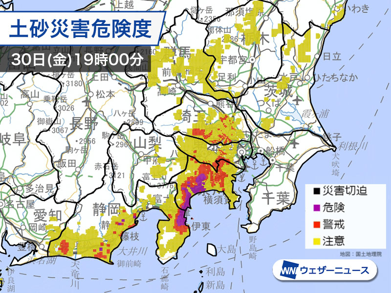神奈川県から東京都、埼玉県や静岡県にかけては土砂災害の危険度が高くなっていて、特に神奈川県西部や静岡県東部では「危険」レベルの所が広がっている状況です。強い雨の峠は越えるものの、引き続き湿った空気が流れ込んで、雨は降りやすくなります。