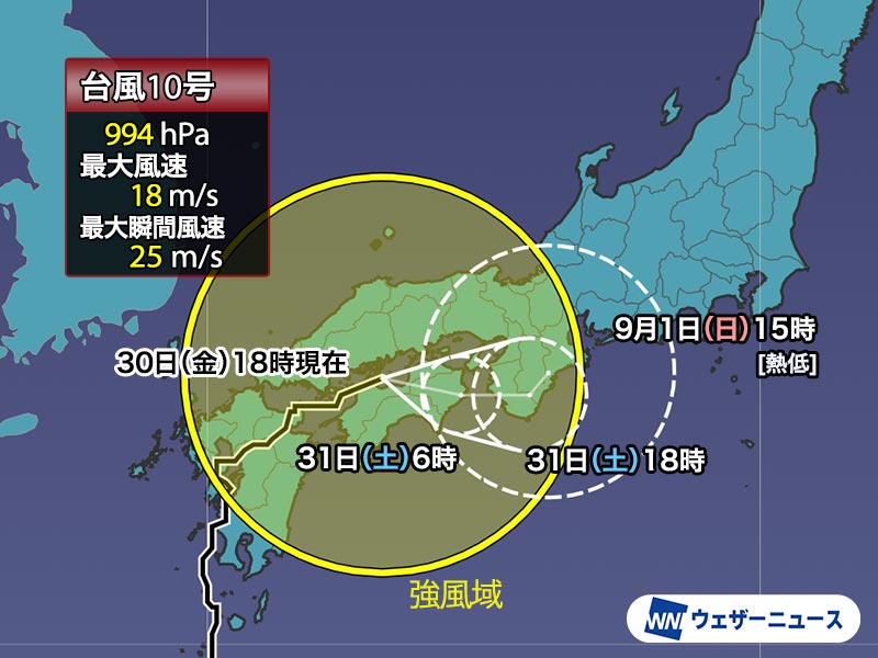 8月30日(金)18時現在、台風10号(サンサン)は愛媛県今治市付近を東北東に進んでいます。この後も東寄りに進んで四国に再上陸する見込みです。明後日9月1日(日)には紀伊半島付近で熱帯低気圧に変わるとみられます。